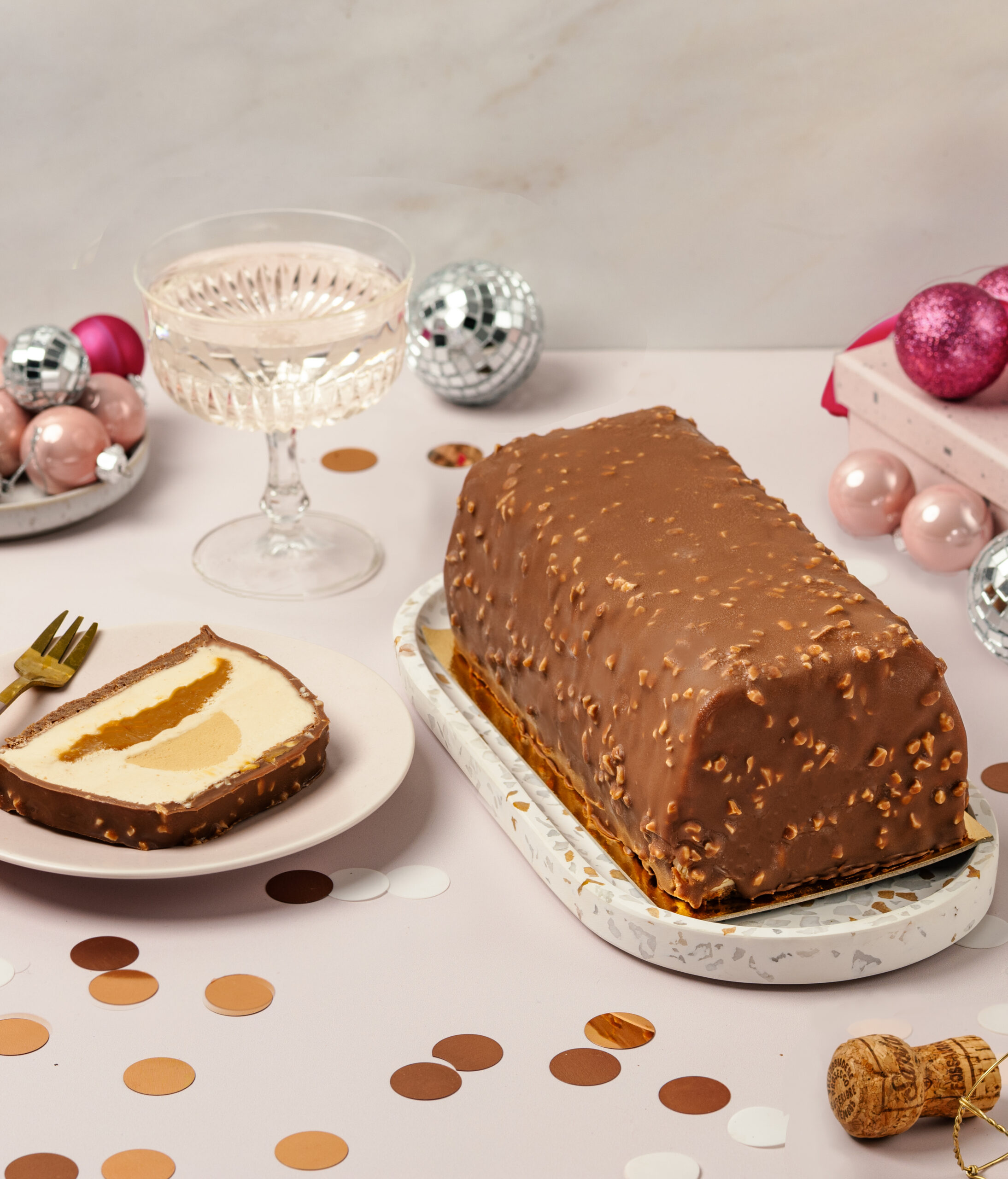 Cette bûche est composée d’un biscuit croquant, surmontée d’une crème glacée cacahuète et son cœur crème glacée caramel au beurre salé et coulis caramel au beurre salé avec cacahuètes torréfiées et enrobage chocolat au lait avec amandes.